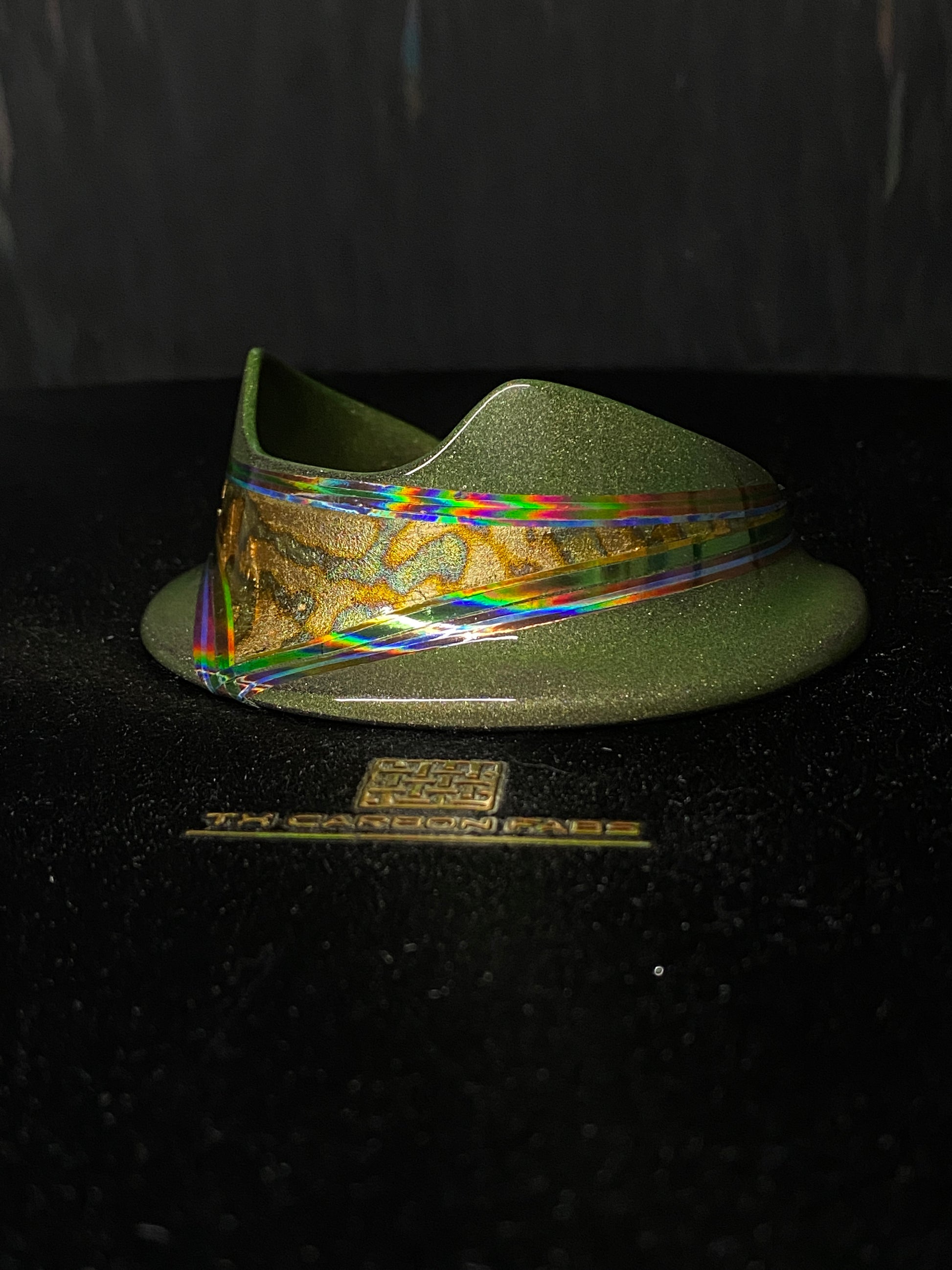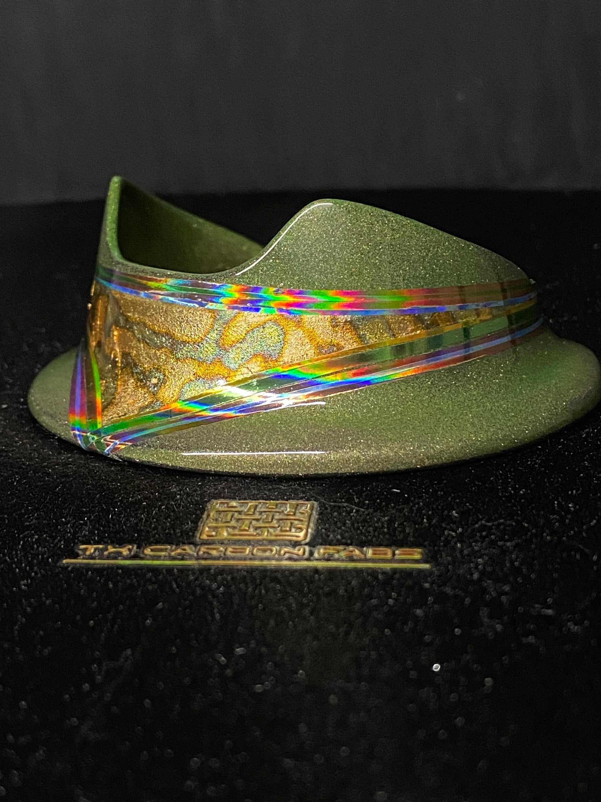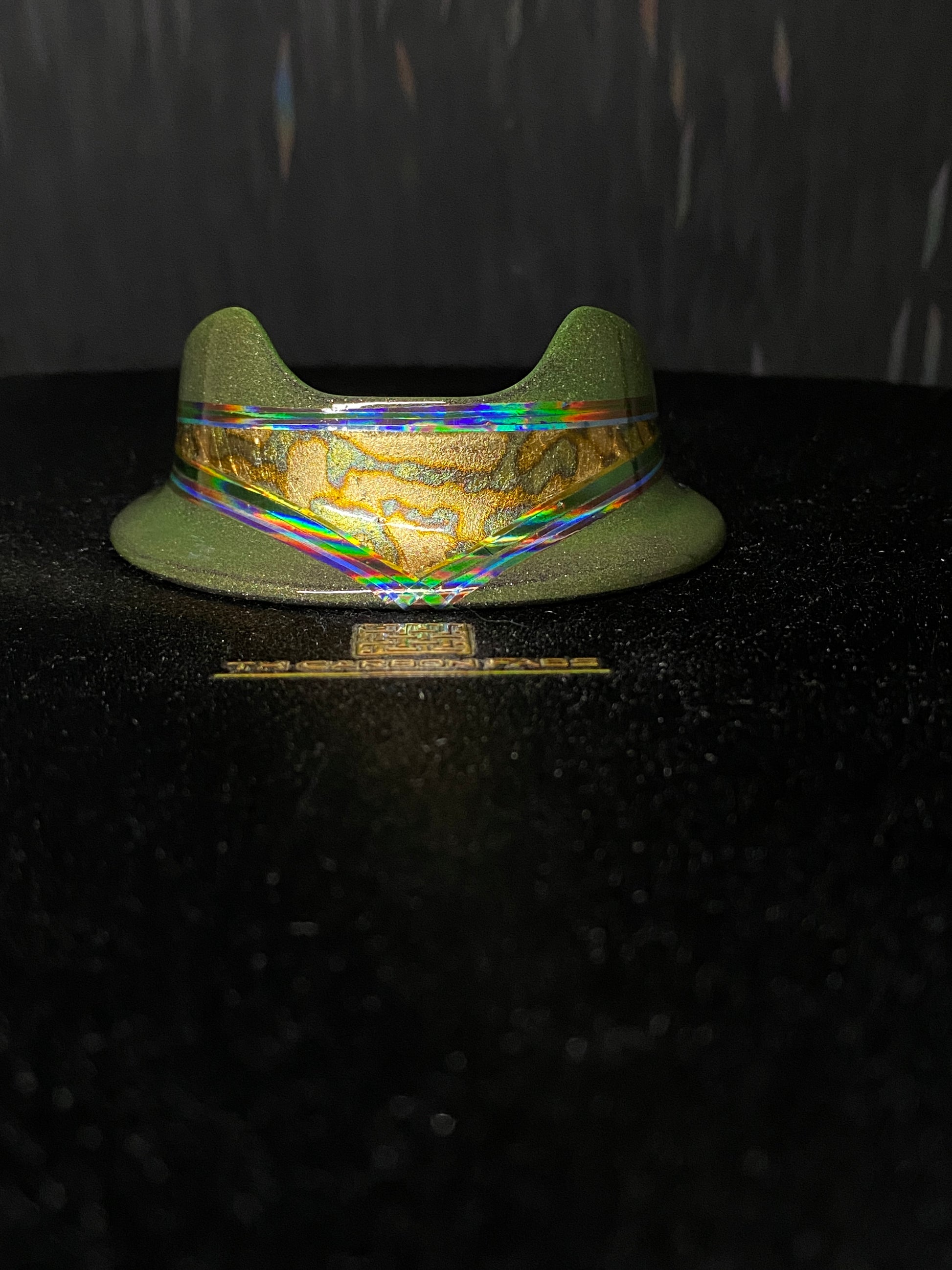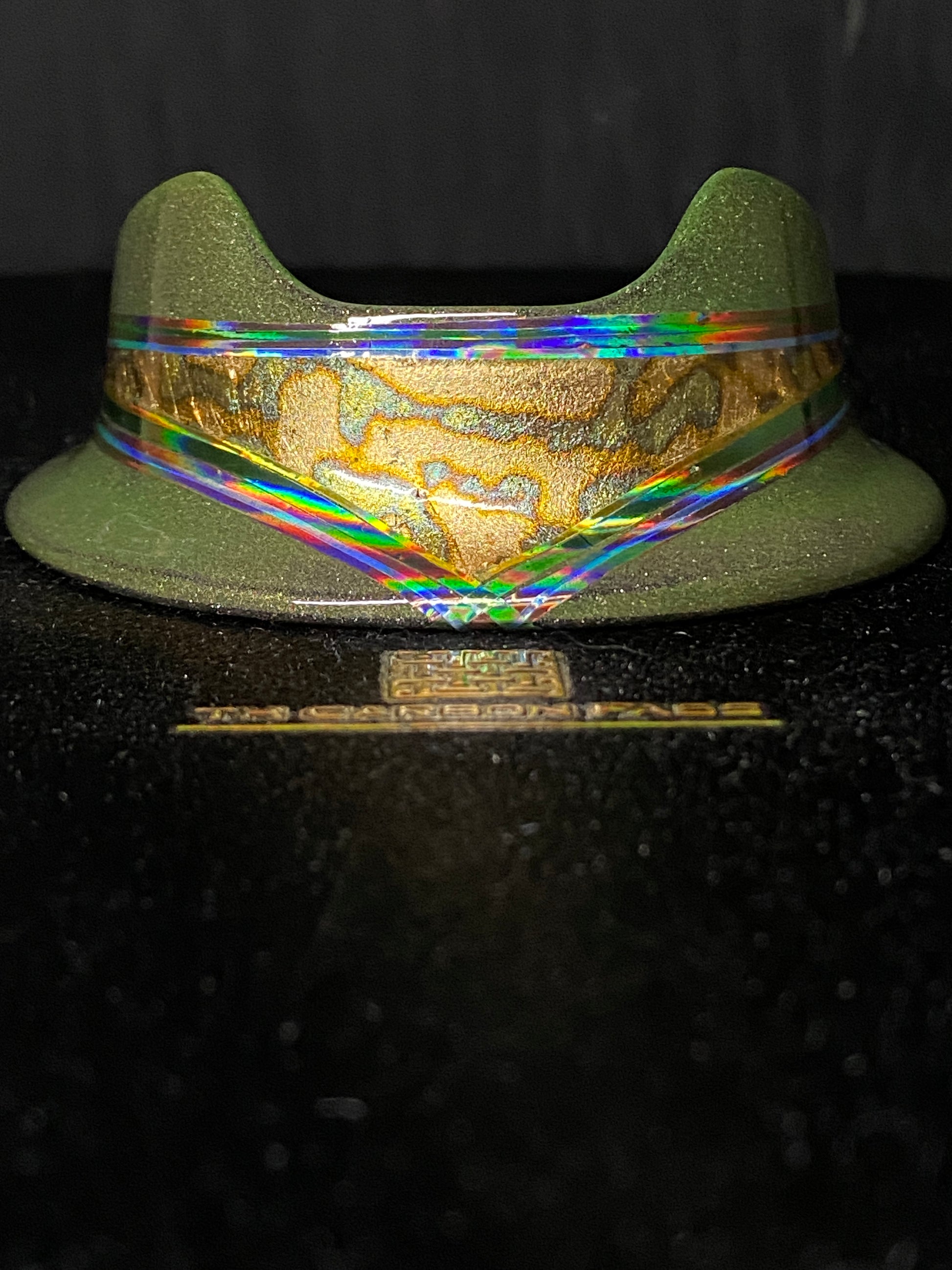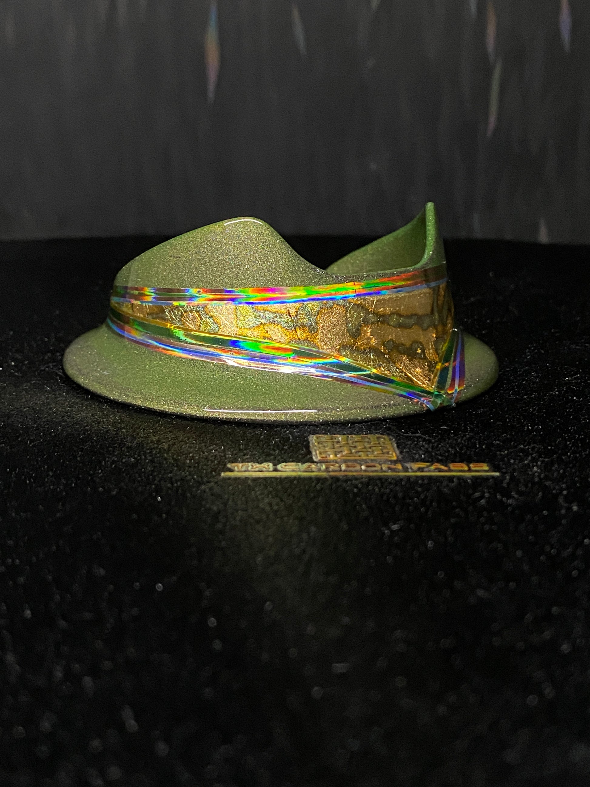 “Galactic GI-Joe” With a structure of epoxy and stainless steel, this is a very solid base for any Puffco Peak Pro. Multi staged layered finish. Gilded anodized gold copper leaf, quad stacked holographic pinstripe (copper, green, blue and gold. Finished with a protective clear coat and polished to perfection.